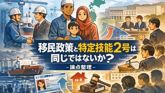 ## 先に要点(論点)- 1. 特定技能2号は実質的な永住権に近い在留資格であり、従来の「移民政策」の定義と重なる側面がある- 2. 制度設計上は「移民政策」を明示していないが、長期滞在・家族帯同が可能な点で政策的な位置づけが曖昧になりやす...
