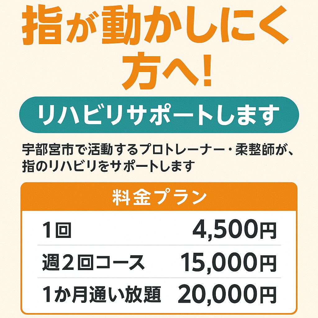 当院では、柔整師・プロトレーナーとしての豊富な経験 をもとに、指の機能改善を目的としたリハビリを行っています。